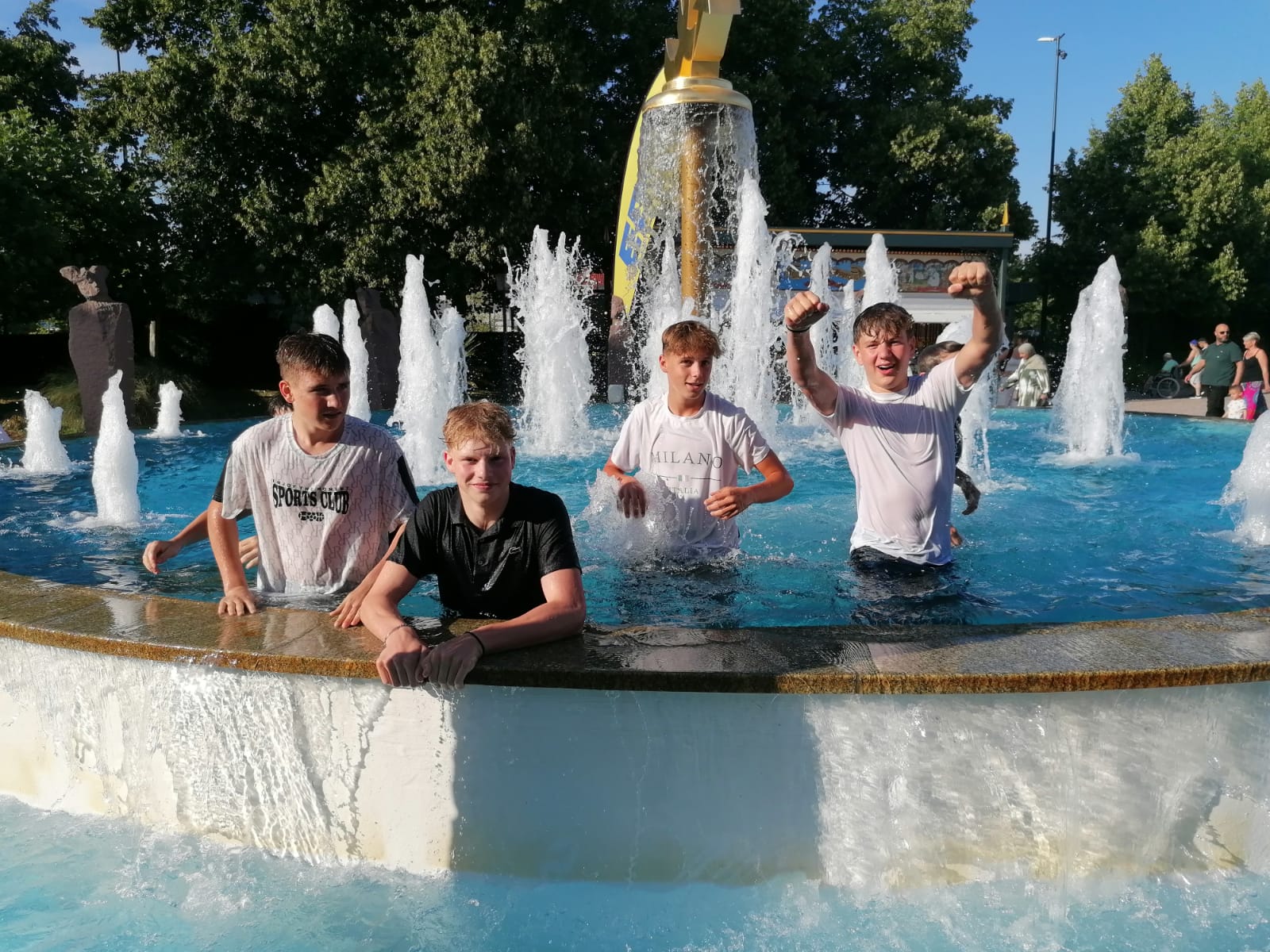 Gegen 19:15 Uhr war dann Treffpunkt. Man merkte den Jungs deutlich an, dass Schlafmangel und Hitze ihren Tribut gefordert hatten – einige waren schon 30 Minuten vorher da und wollten einfach nur noch ihre Ruhe. Andere kamen auf die grandiose Idee, sich im großen Eingangbrunnen des Parks abzukühlen… leider ein nur kurzer Spaß, denn der Sicherheitsdienst war schnell zur Stelle