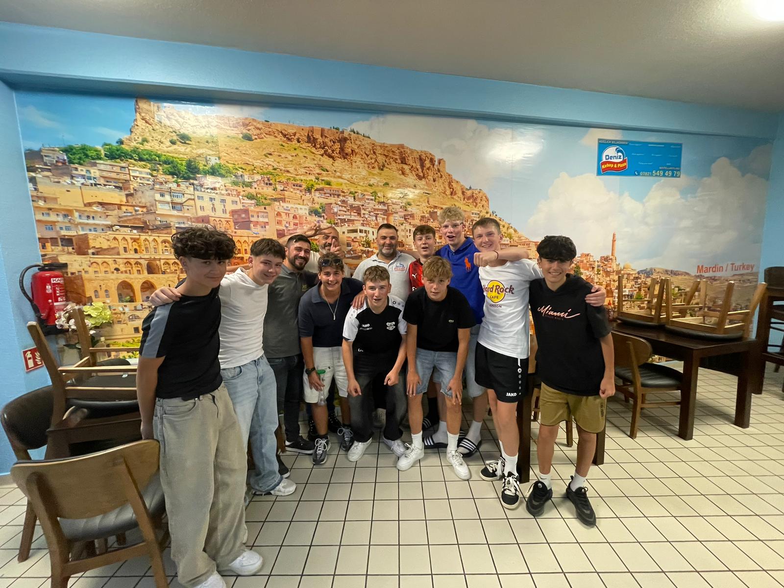 Am Abend war bei einigen der Magen schon wieder leer – sei es aus Hunger oder anderen Gründen – und so zog die Meute los ins Lahrer Nachtleben. Ein Dönermann war schnell gefunden, der sich als echter „Gönner“ entpuppte und den Jungs zu ihrem Essen mehrere 1,5-Liter-Flaschen Getränke spendierte. Der Dank: ein stolzes Gruppenfoto.