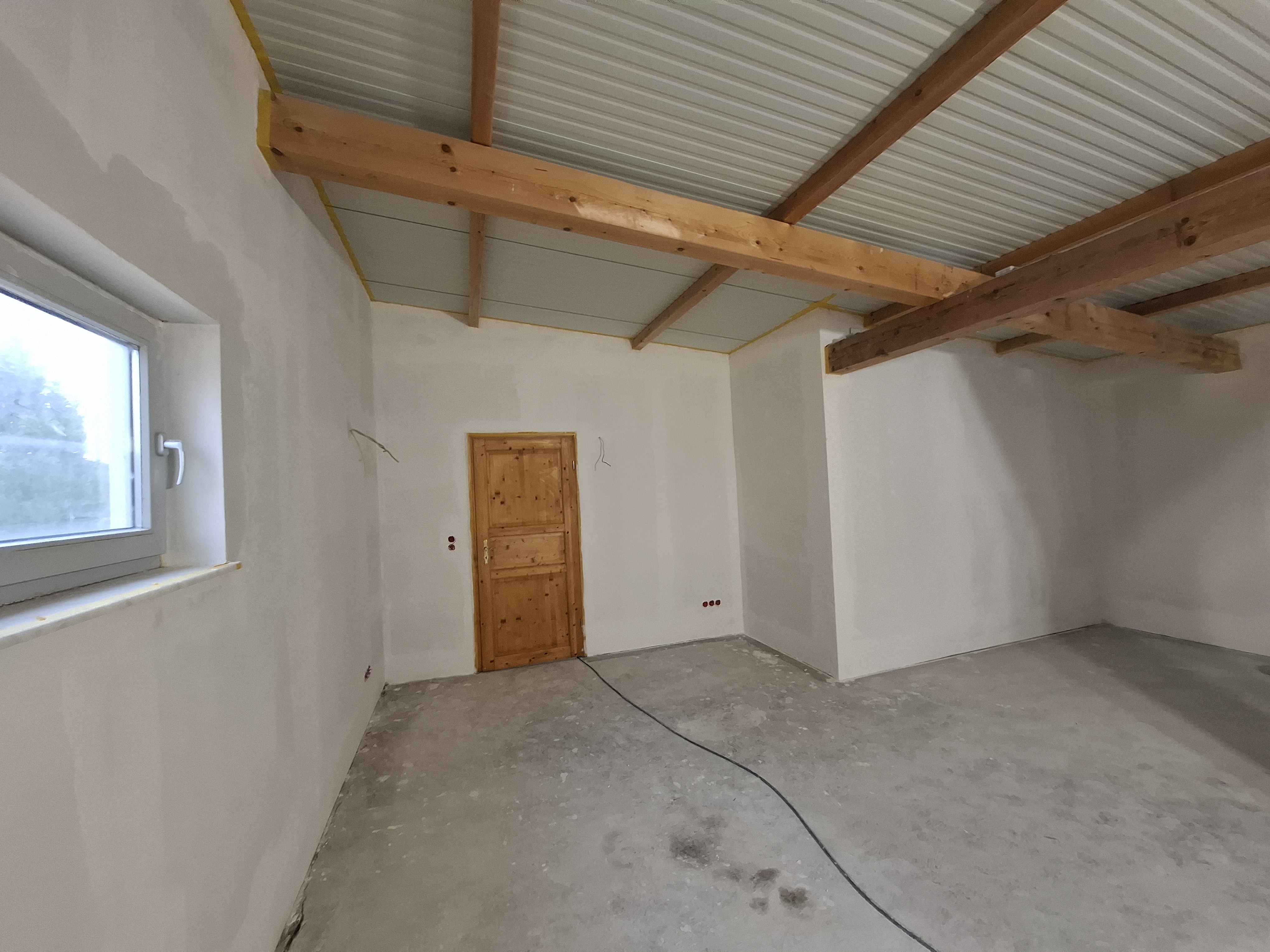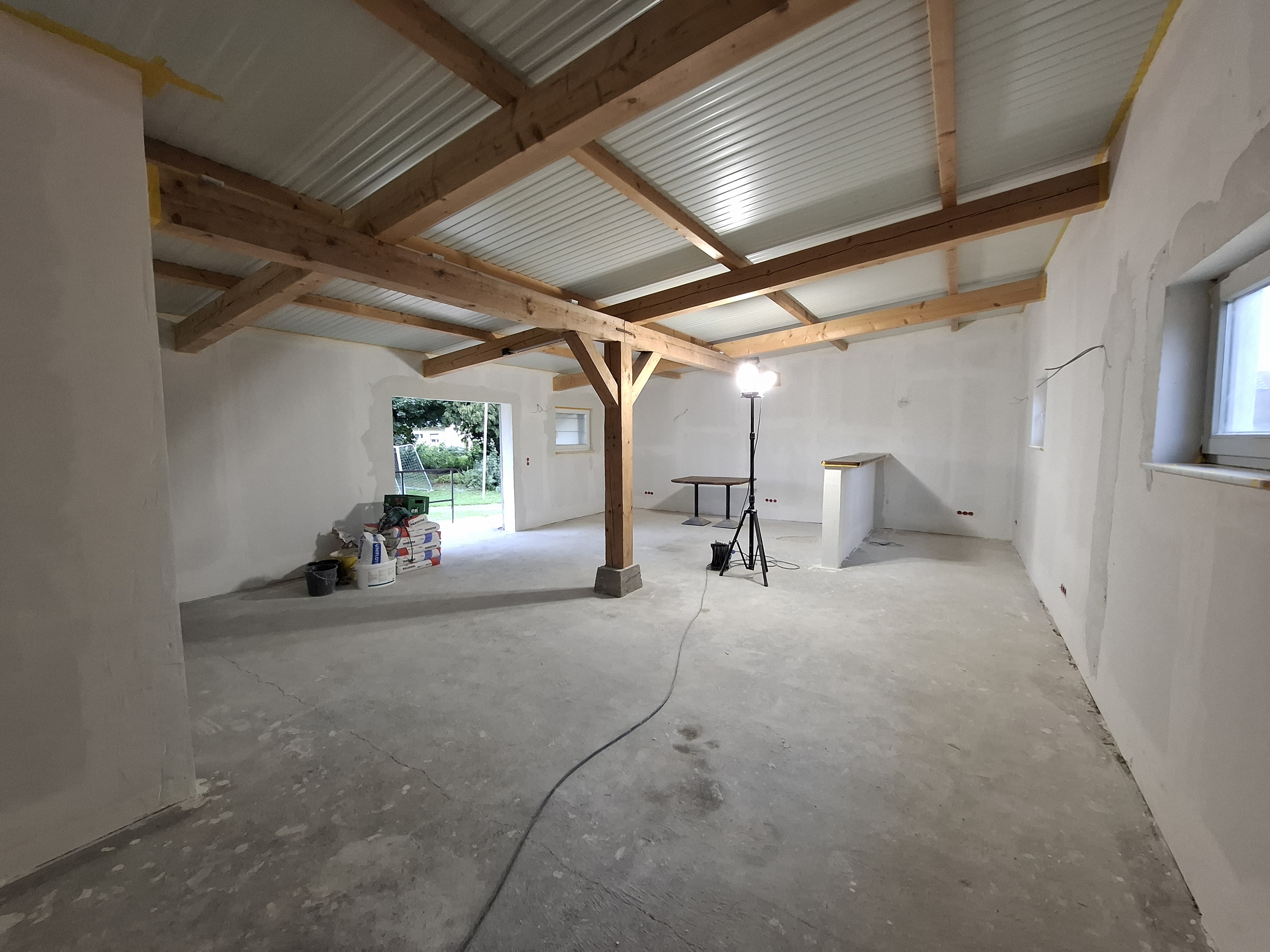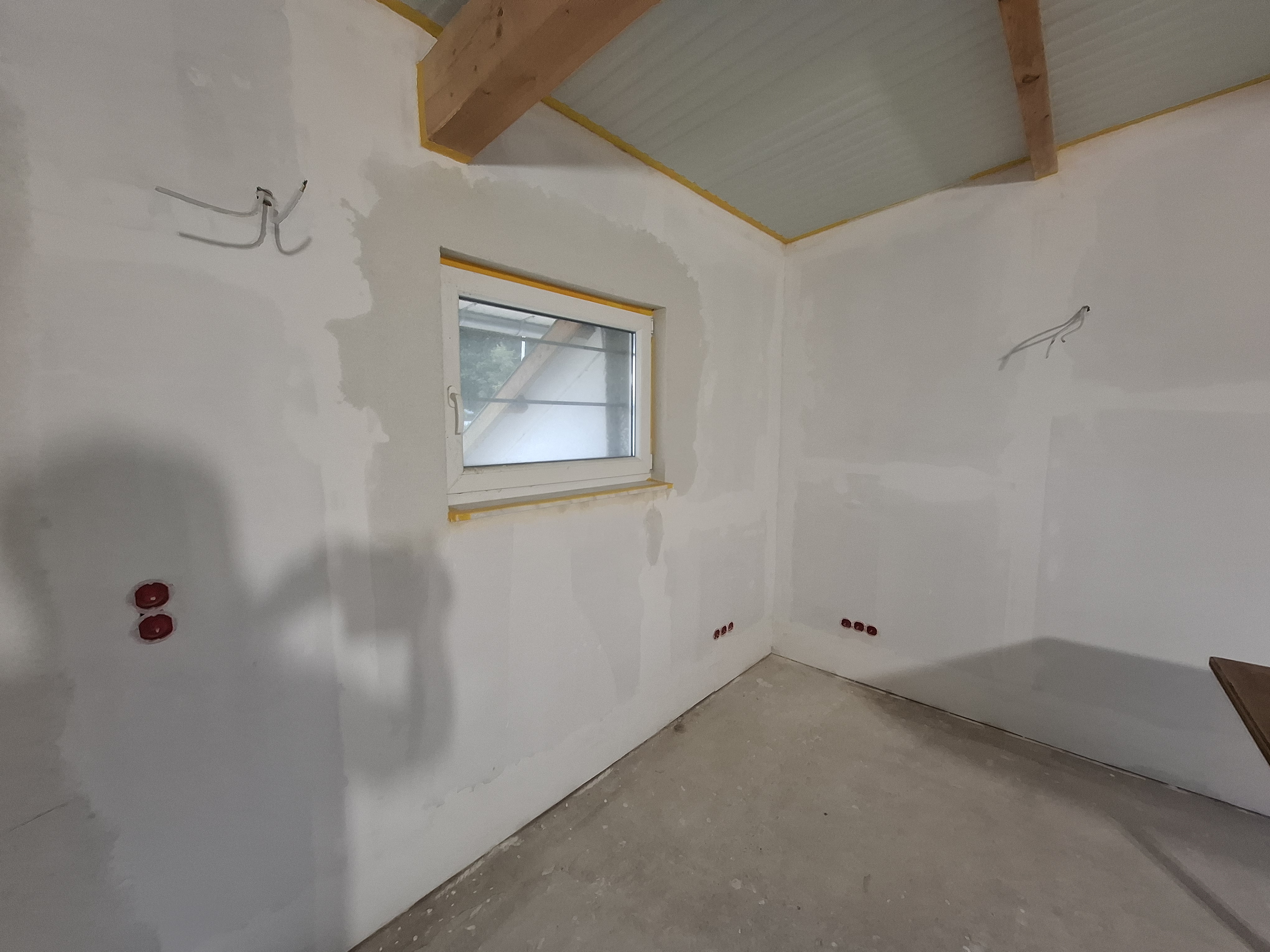Begonnen wurde mit dem Abbau der Raumtrenner und der überflüssigen Balken, sodass wir quasi einen Rohbau hatten. Eine Truppe machte sich dann zusammen mit Jeton ans Werk und errichtete an den Schnittstellen zwischen Wänden und Decke eine Kaltluftsperre aus Styropor. Die Elemente mussten aus großen Styroporplatten mit dem Fuchsschwanz herausgesägt werden, und anschließend fachgerecht verklebt und abgedichtet werden.